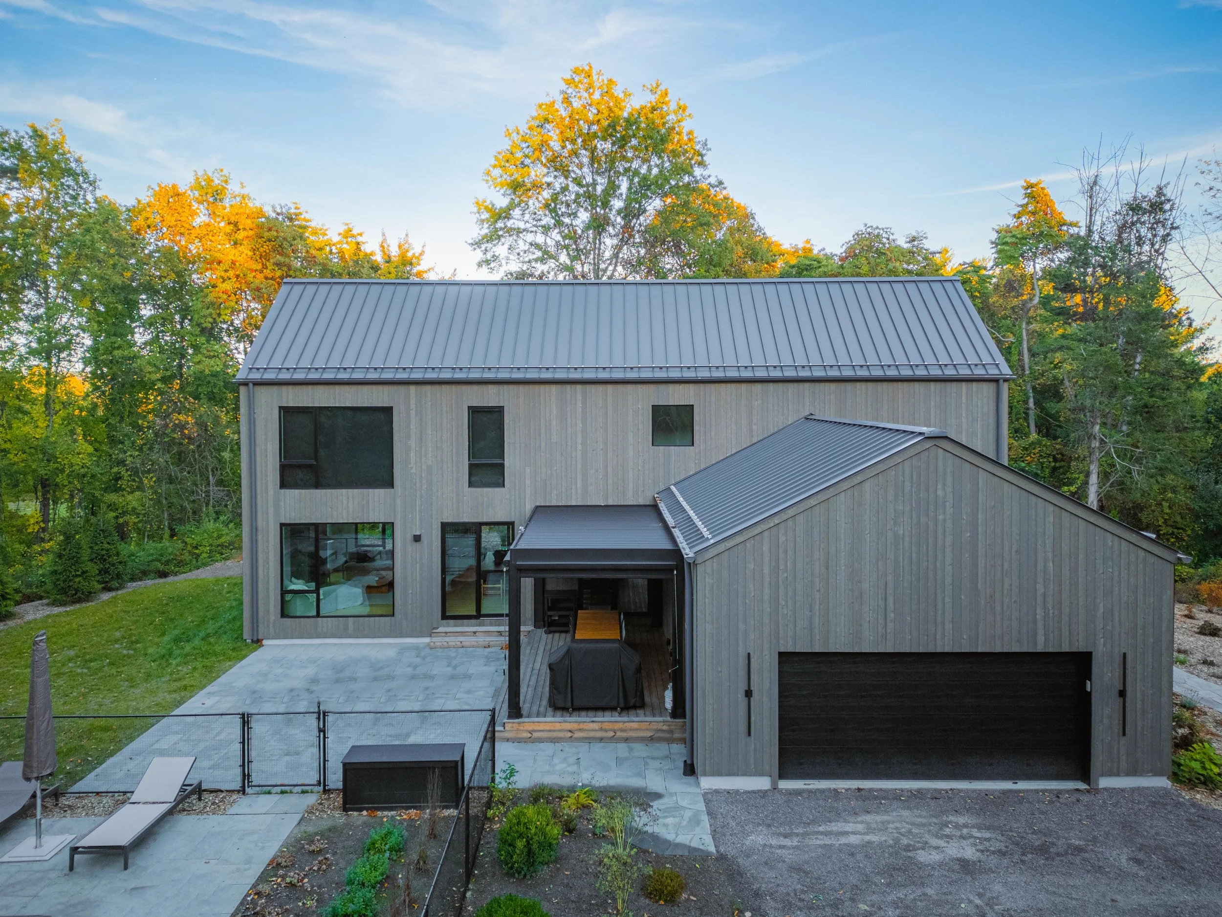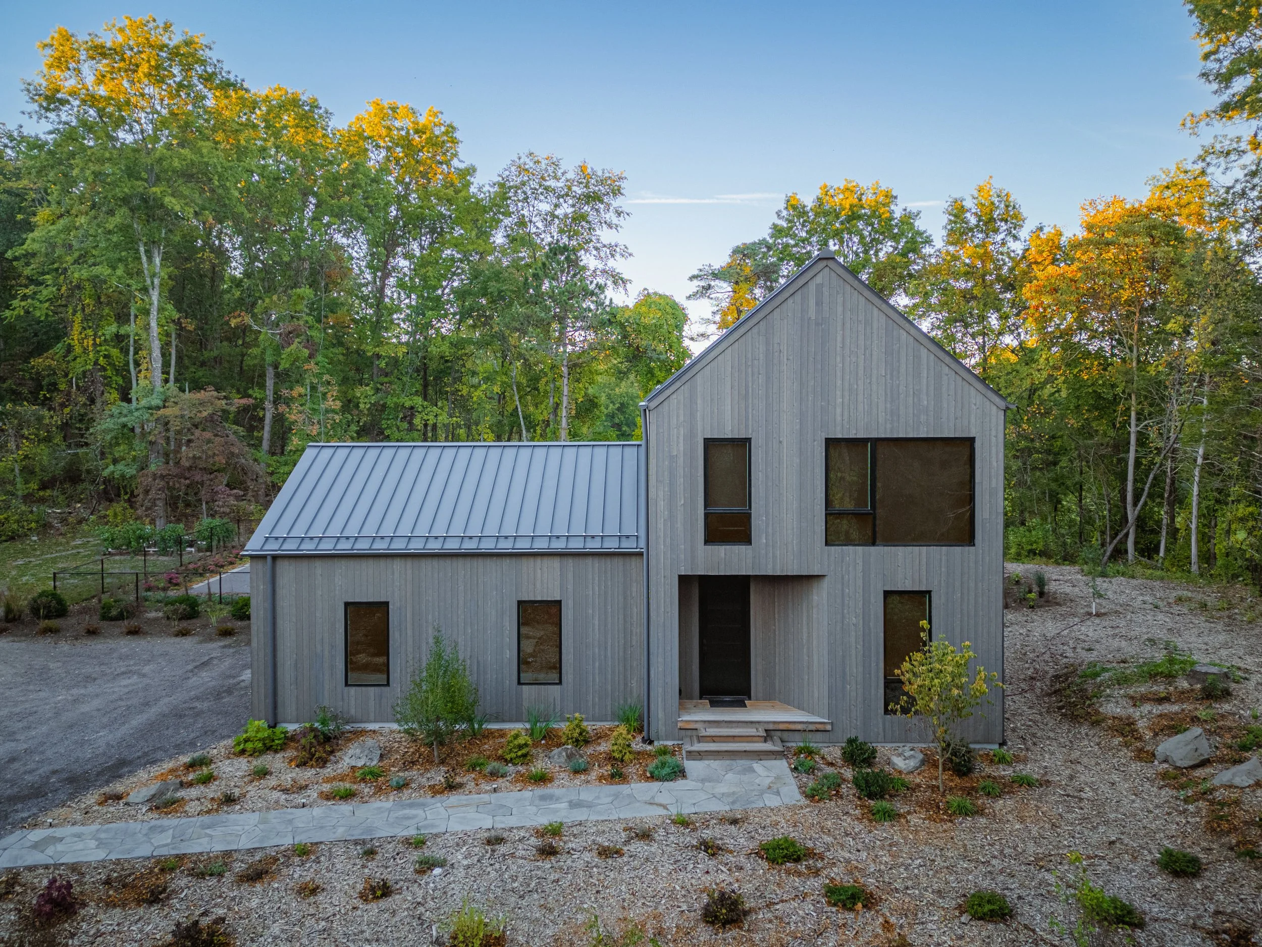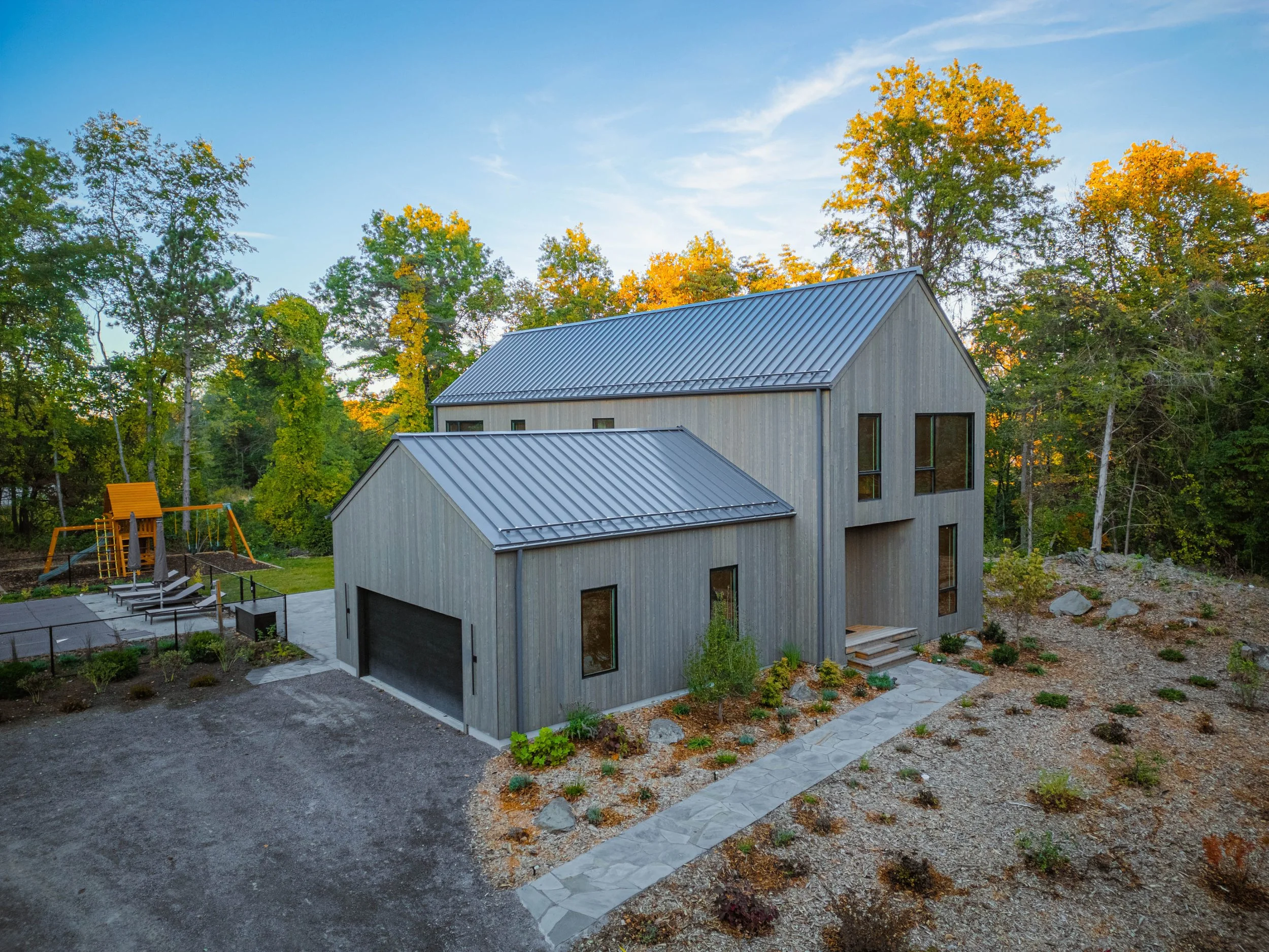 The Elm residence is a study in understated sophistication, in perfect context with the Hudson Valley. The architecture is comprised of two intersecting gable roof wood clad volumes creating inviting indoor and outdoor living spaces.