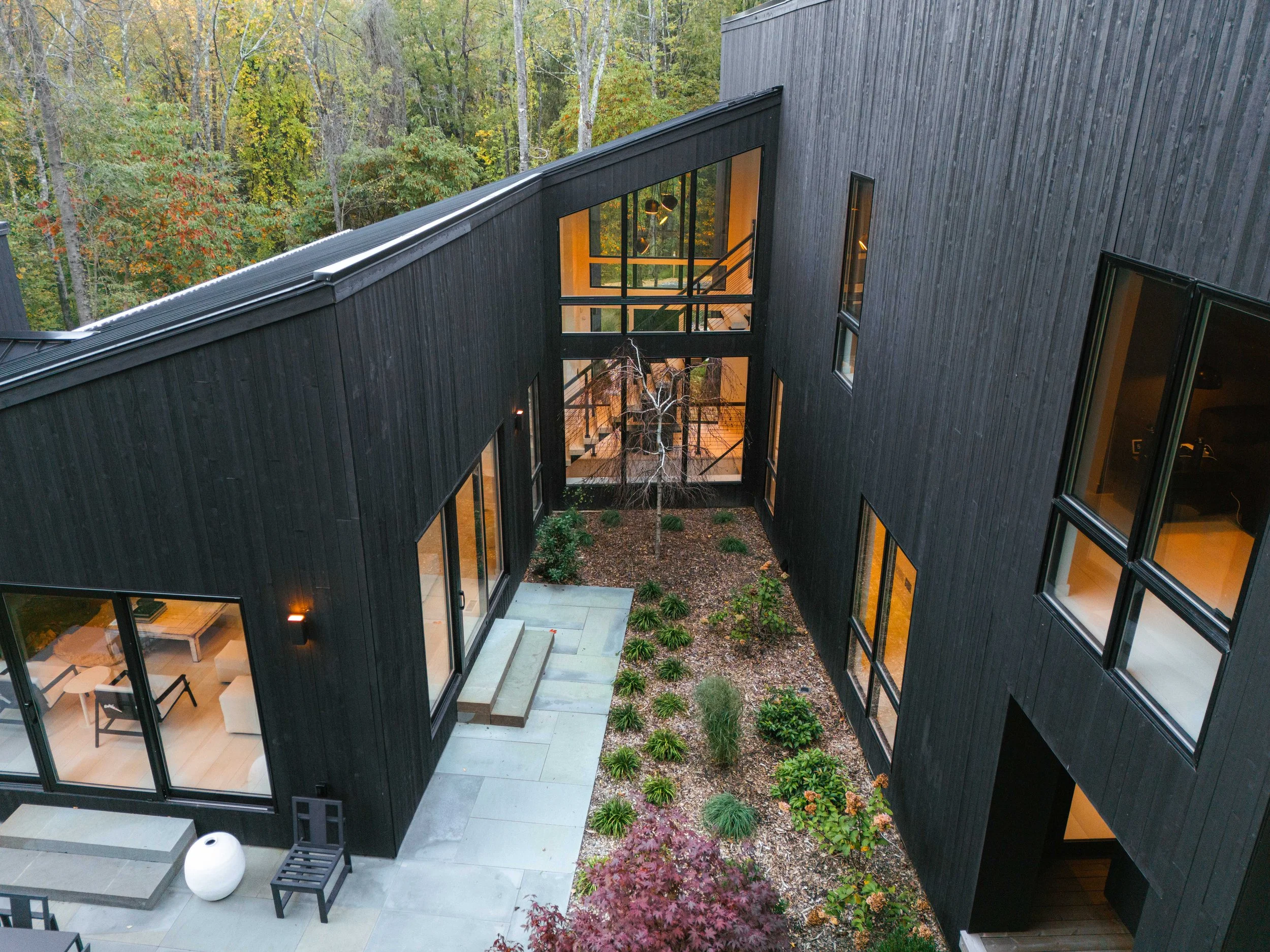 The architecture is comprised of a singular distinctive exterior form with dramatic shed roof. Entering the residence, the central courtyard clad in glazing offers a unique and immediate reconnection with nature. Living spaces on the main level are open plan and share views into the courtyard. The dramatically glazed great room offers views to the landscape and exit into the courtyard and outdoor spaces.